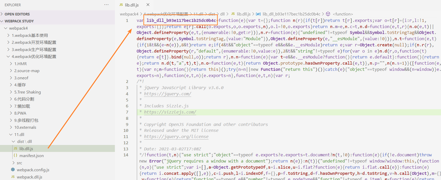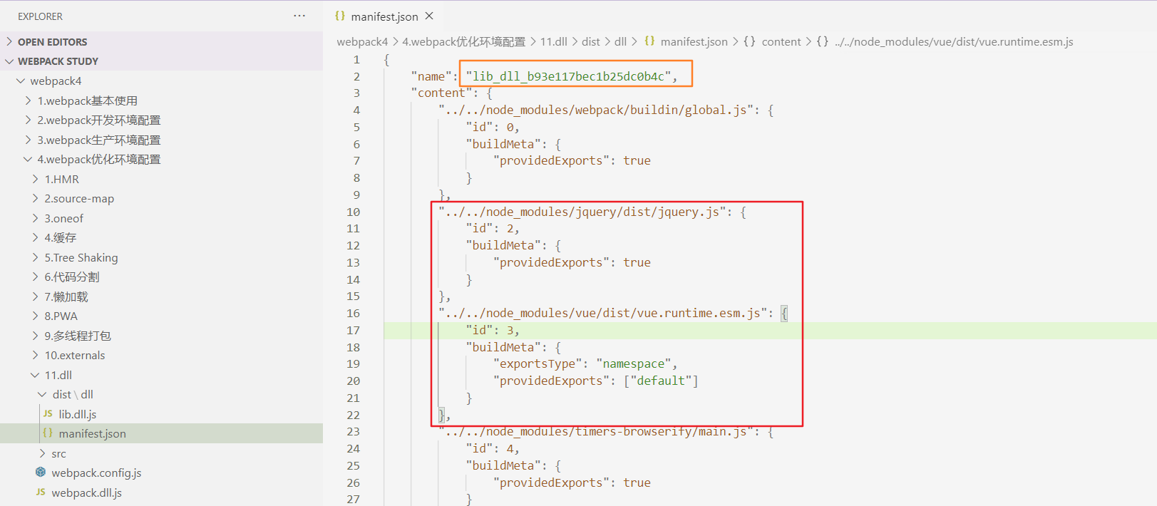 执行完毕后,你会发现在 dist 目录下生成了一个 dll 文件夹,文件夹中包含的 lib.dll.js 存放的就是我们刚才所打包的第三方库( jquery、vue ),而另一个 manifest.json 文件保存的是与 lib.dll.js 所打包出来的库的映射关系: