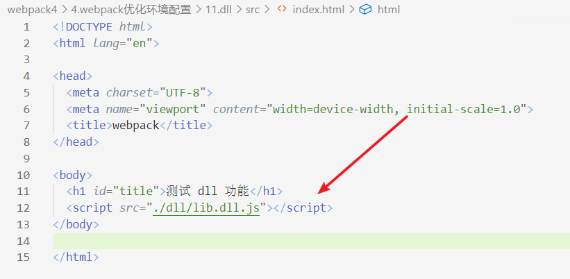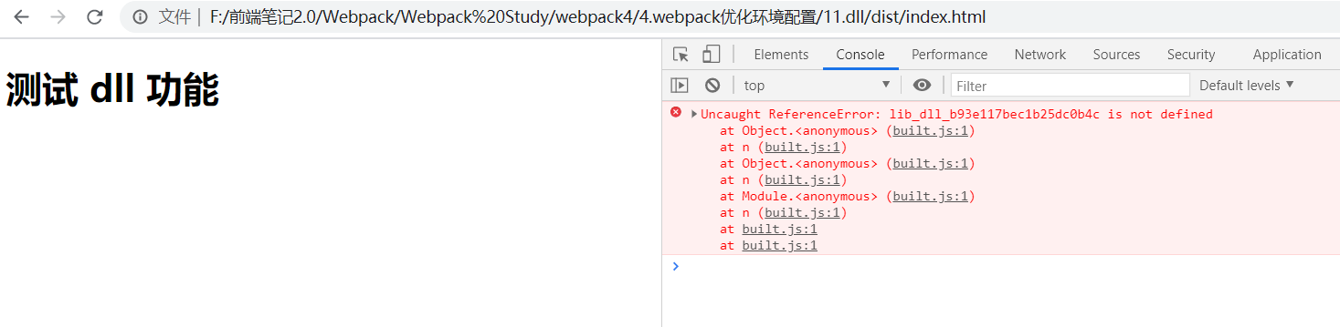 原因很简单,我们还没有引入文件资源,我们需要在 index.html 中对单独的 lib.dll.js 库进行引入: