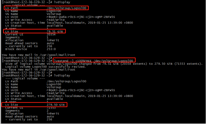 # lvextend -l +100%FREE /dev/VolGroup/LogVol00 --把剩余的卷组空间全部扩容到逻辑卷