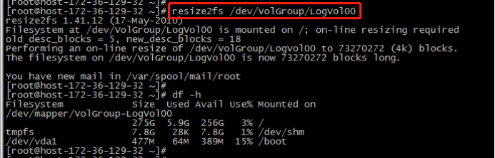 #resize2fs /dev/VolGroup/LogVol00 --重新识别/dev/VolGroup/LogVol0的磁盘信息
