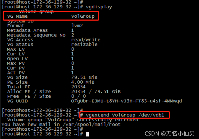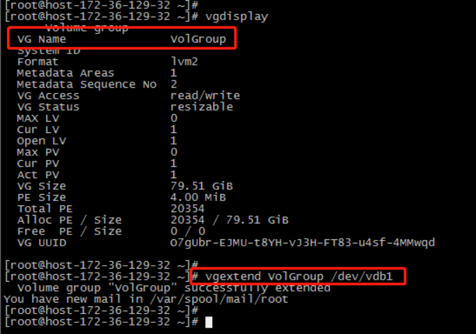 #vgextend VolGroup /dev/vdb1 --把物理卷/dev/vdb1 扩展到VolGroup卷组上