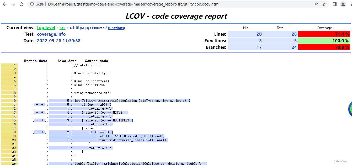 总体信息里面有行覆盖率,函数覆盖率,分支覆盖率,这三个数据具体什么以上自行百度,特别是分支覆盖率。