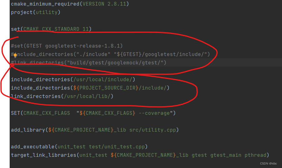 因为我们本地已经安装了 gtest,修改下demo 中的 CMakeLists.txt 内容,注释掉构建 gtest 的内容,把库文件路径和头文件路径加上去。