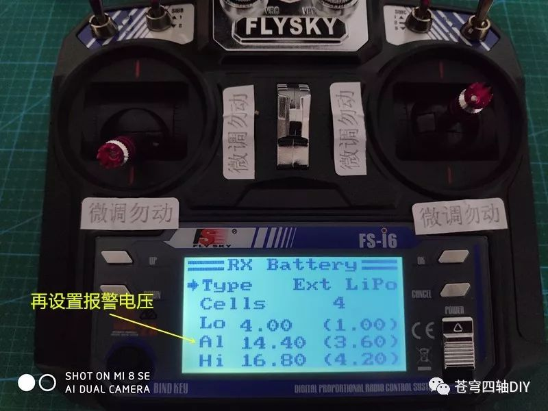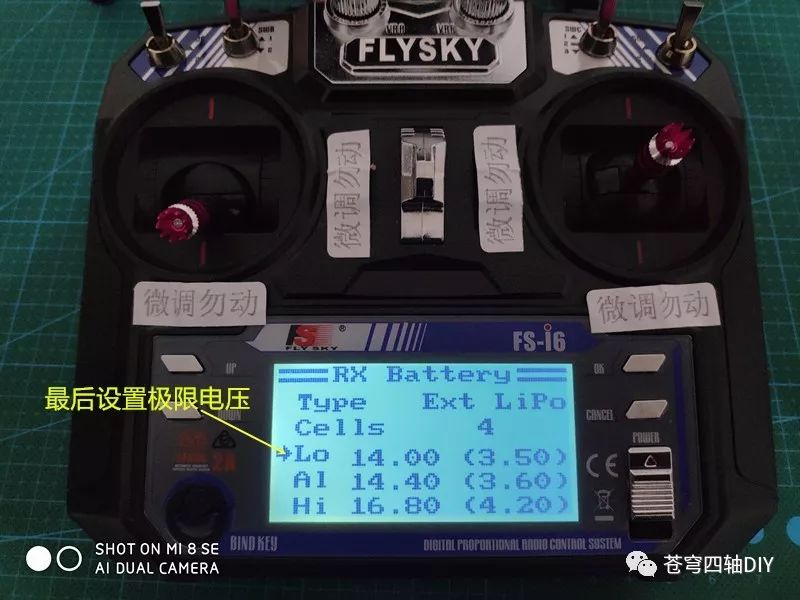 以后当电池电压达到报警值,遥控器显示器上面RX电池处会闪烁报警,同时会有声音提示(遥控器的提示音比较小)。