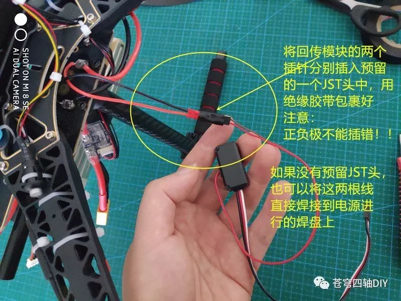 将回传模块的两个插针分别插入预留的一个JST头中,用绝缘胶带包裹好,注意:正负极不能插错!!!