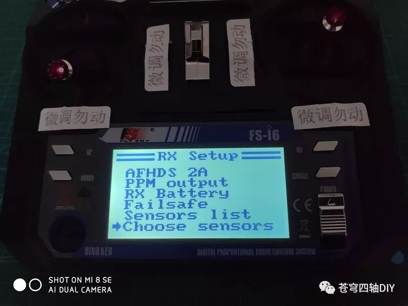 长按OK键,进入菜单,选择遥控器图标->RX Setup->Choose sensors,如下所示: