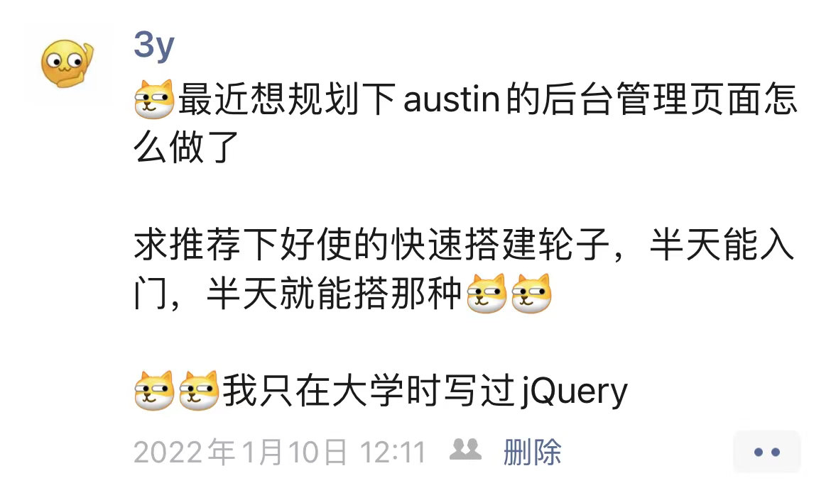 从我筹划要写austin项目的时候,我就知道我肯定要写一个「后台管理页面」,但我迟迟没下手。一方面是我认为「后端」才是我的赛道,另一方面我「前端」确实菜,不想动手。