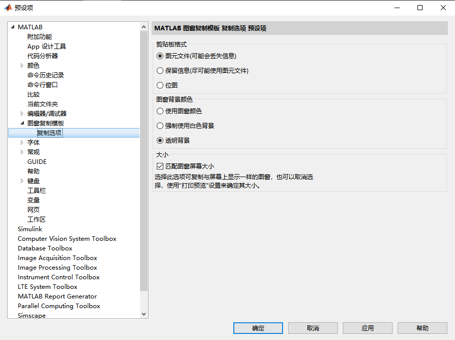 利用figure窗口里面的复制图窗可以进行简单的矢量图输出,点击编辑→复制选项,选择如图中的选项,背景可以选择常用的透明背景,注意选择“图元文件(可能会丢失信息)”的选项,然后选择复制图窗,复制粘贴就好了。但是这样也会丢掉部分信息,变成位图,只是比单独复制位图效果要好一些。