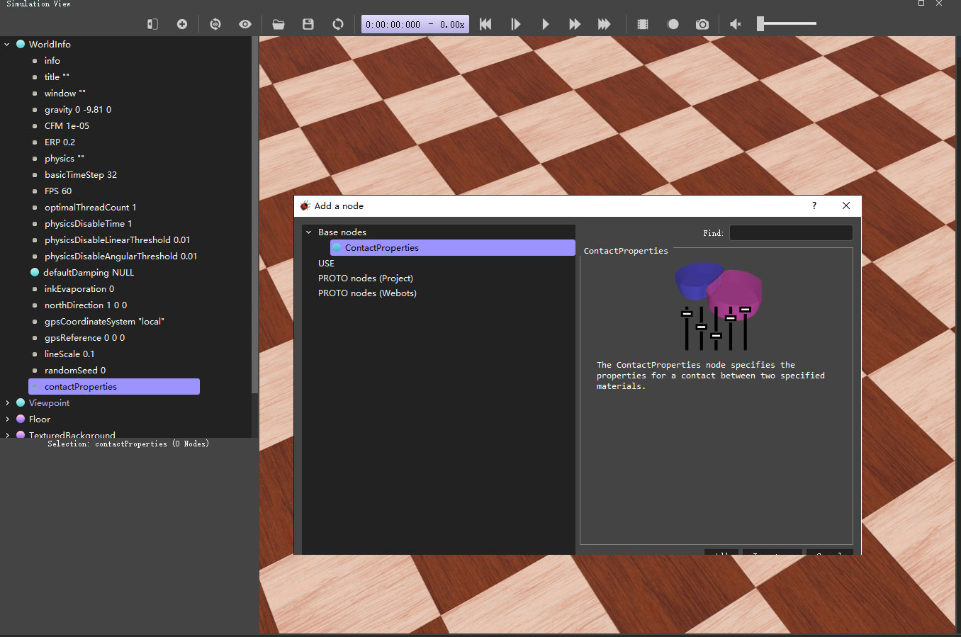 设置方法:首先停止仿真。在Webots左边栏WorldInfo节点下,双击contactProperties,添加ContactProperties节点