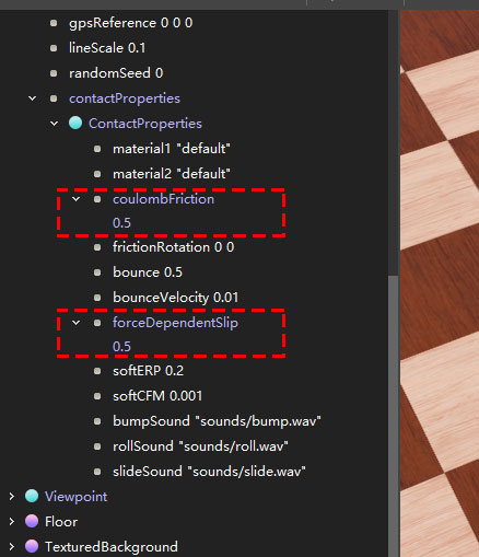 coulombFriction字段是库仑摩擦系数。取值范围在0到正无穷的范围内(正无穷用-1表示)。0产生无摩擦接触,正无穷产生永不滑动的接触。