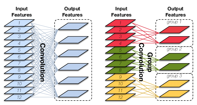 如分组卷积示意图的左图所示,对于普通卷积,每一个输出通道都需要用到所有输入通道的数据。为了减少计算量,我们可以把输入通道和输出通道分组。每组的输出通道仅由该组的输入通道决定。如示意图的右图所示,我们令分组数groups=3,这样,一共有6个卷积核,每组的输入通道有4个,输出通道有2个(即使用2个卷积核)。这时候,卷积核组的形状应该是(C’=6, f, f, C=4)。
