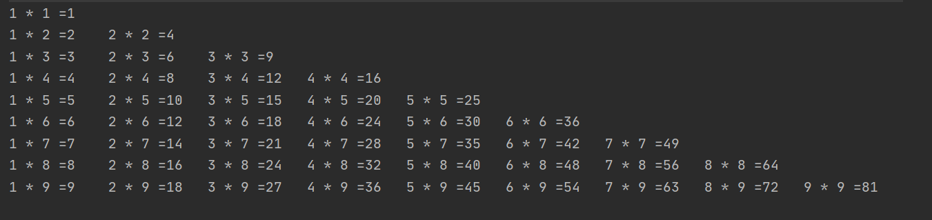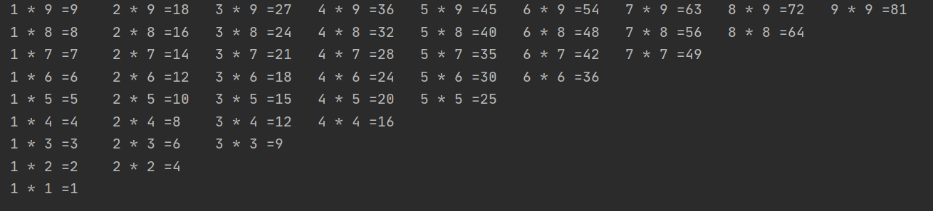 System.out.print(j + " * " + i + " =" + j * i + "\t");