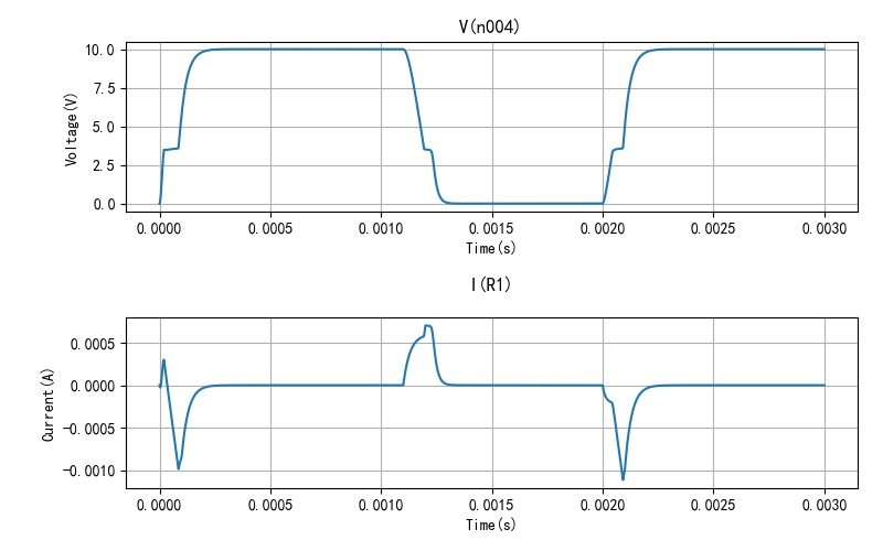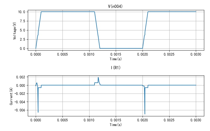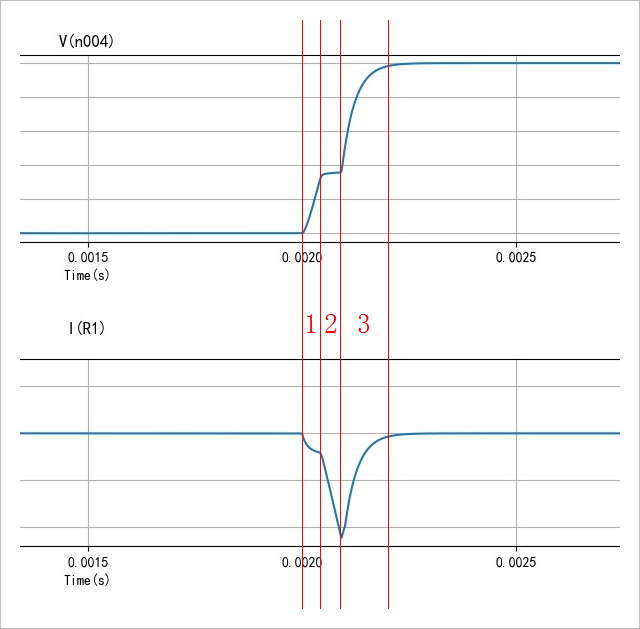 为了分析台阶产生的过程, 下图给出了仿真电路中 MOS 管的栅极电压与电流波形。