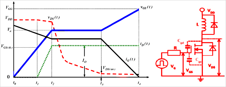 阶段1:栅极电压从 0V 开始增加到 MOS 管导通过程。在此过程中, Miller 电容不起作用,是驱动电压通过栅极电阻给 Cgs 充电过程;