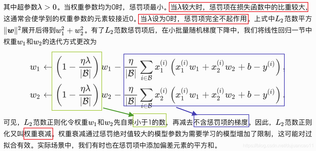 L2 范数正则化在模型原损失函数基础上添加L2 范数惩罚项,从而得到训练所需要最小化的函数。 范数惩罚项指的是模型权重参数每个元素的平方和与一个正的常数的乘积。以3.1节(线性回归)中的线性回归损失函数