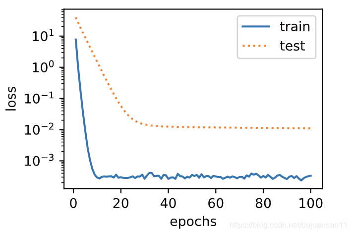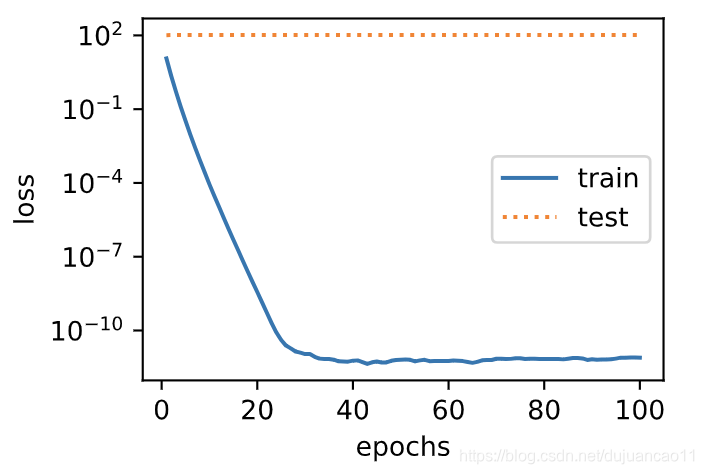 # 结果训练误差远小于测试集上的误差。这是典型的过拟合现象。