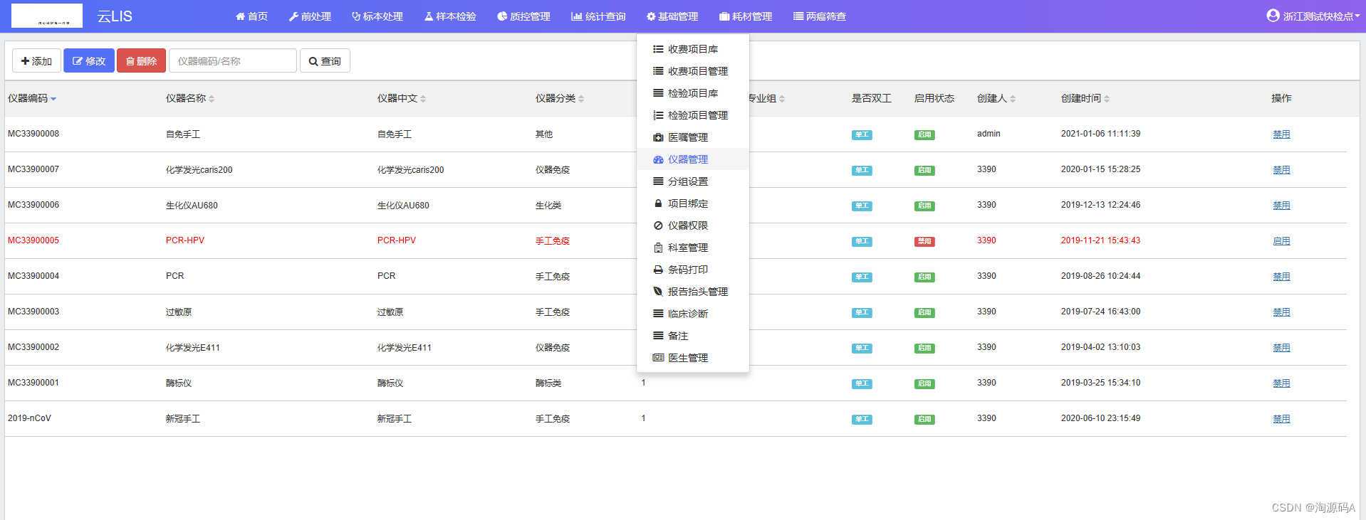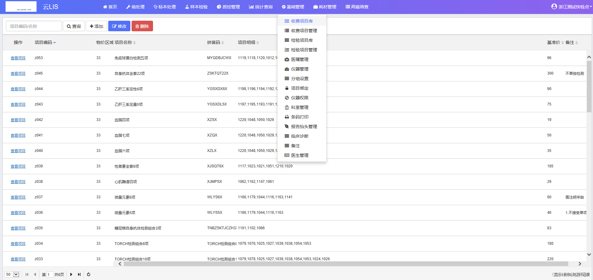 收费项目库、收费项目管理、检验项目库、检验项目管理、医嘱管理、仪器管理、分组设置、项目绑定、仪器权限、科室管理、条码打印、报告抬头管理、临床诊断、备注、医生管理、参数管理、标本跟踪、实验室基础项目管理、收费项目申请、医院管理、审核人员设置、外送条码管理