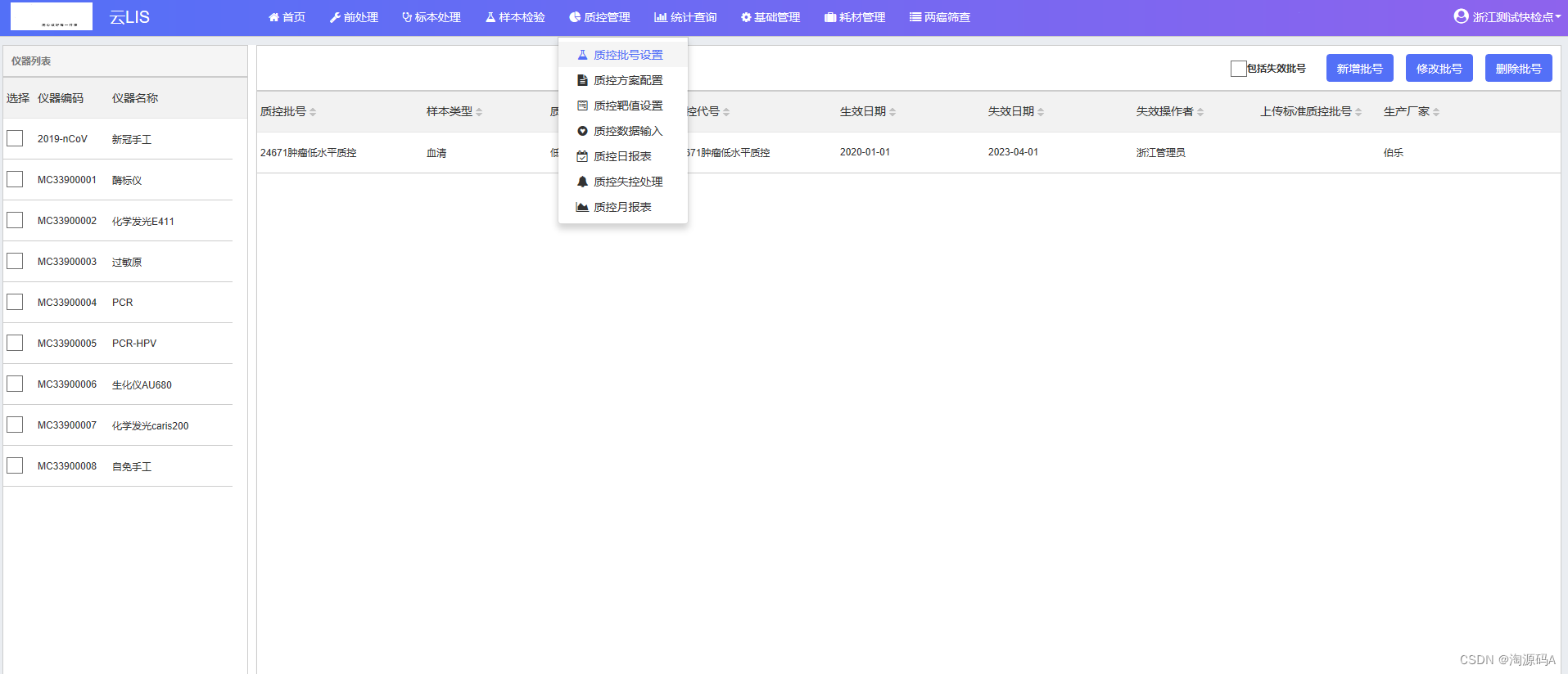 质控批号设置、质控方案配置、质控靶值设置、质控数据输入、质控日报表、质控失控处理、质控月报表