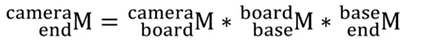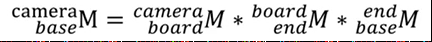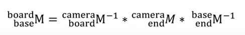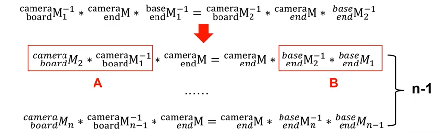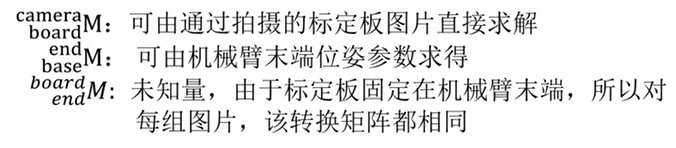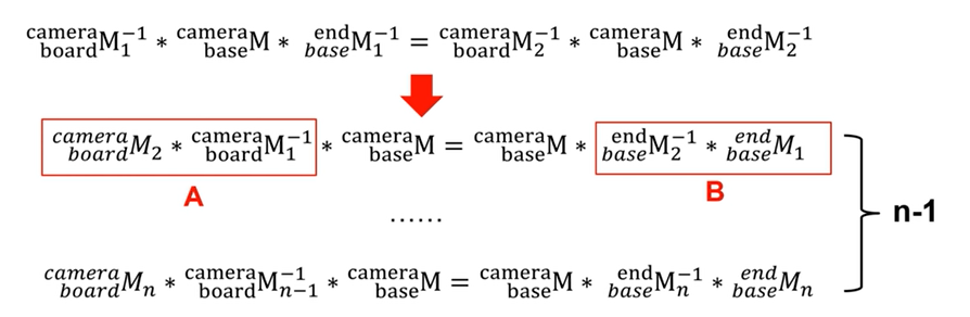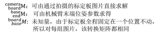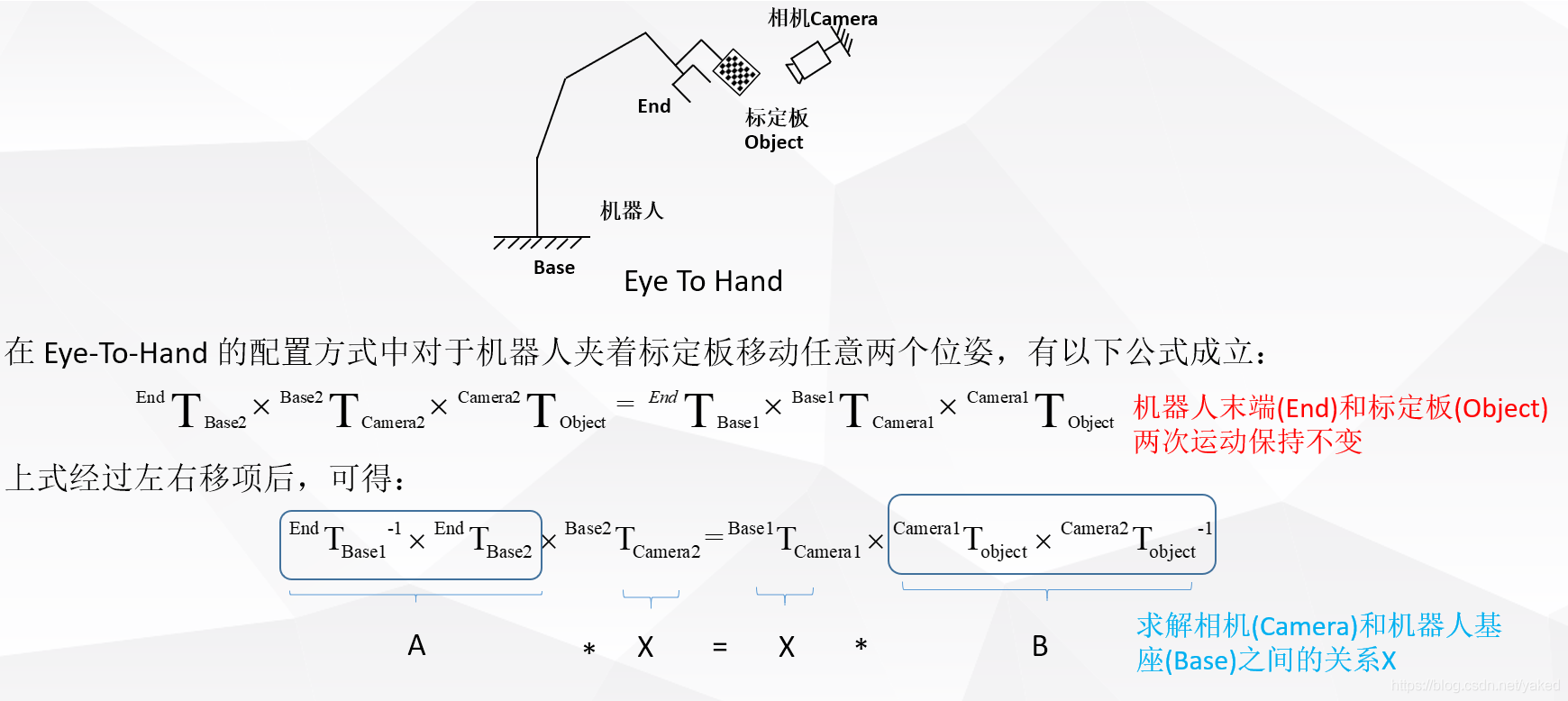 摄像机由于固定在机械臂末端,这种关系下,两次运动,机器人底座和标定板的关系始终不变,求解的量为相机和机器人末端坐标系的位姿关系。