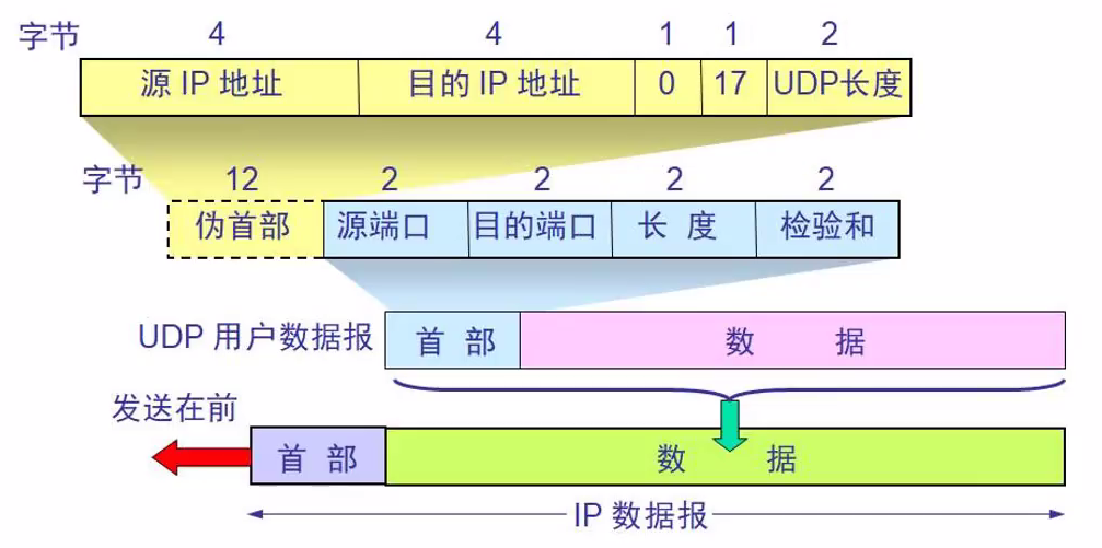 - 伪首部+首部+数据,伪首部占用12字节,仅在计算检验和时起作用,不会传递给网络层