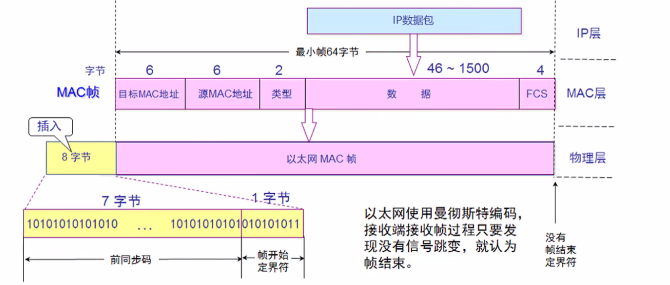 - Ethernet V2帧的格式是没有帧开始符和帧结束符的,而是接收端接收帧过程之遥发现没有信号跳变,就认为帧结束