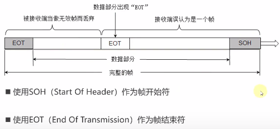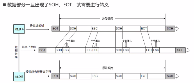 - 一个完整的帧只有一个帧开始符(SOH)和一个帧结束符(EOT),如果数据部分出现了SOH、EOT则需要进行转义,数据部分出现一个SOH、EOT、ESC则在它们前面加上ESC进行字节填充,当接受端的数据链路层收到该帧,如遇见头部ESC就去掉ESC