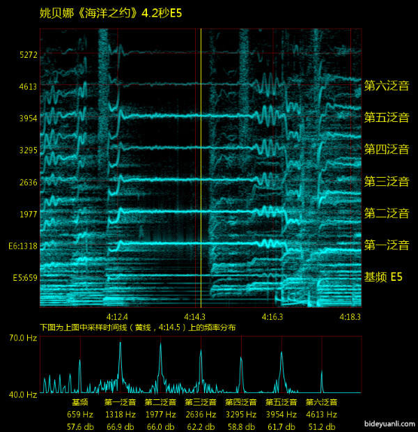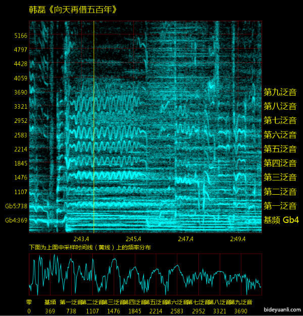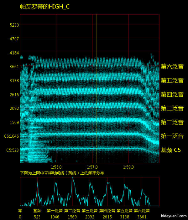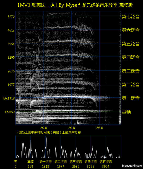 可以看到,此例中第一泛音巨大(看多了就知道,一般都是第一泛音最大),在3000左右的三个泛音也很强。