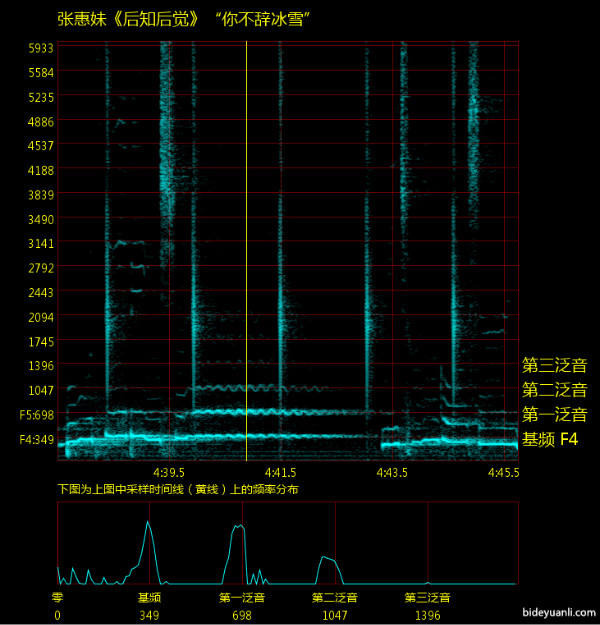 上面的例子可以看出,人声基本都本着标准的“基频/第一泛音(基频的二倍)/第二泛音(基频的三倍)/······”来的。自然界物体振动发声,绝大多数也都是这样的。