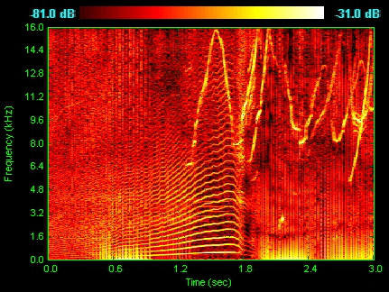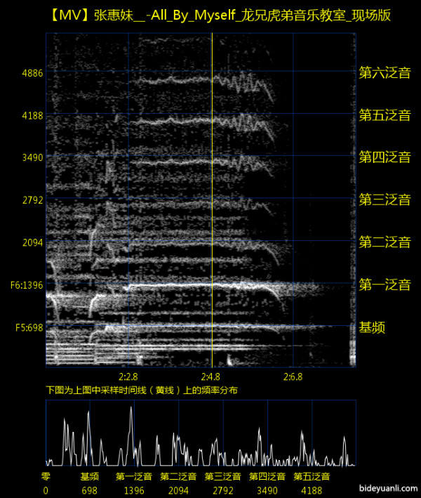 频谱图反应的是在这个时间点上的频率分布情况。严格的说应该是这1/10秒内的平均情况。来一张典型频谱图,看看跟我的图下部是不是一回事: