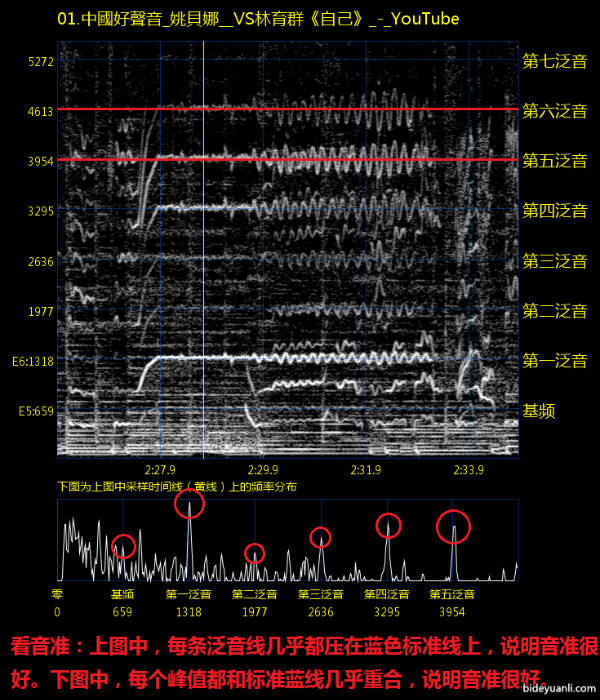我的软件特别加了标准音高线,以及标准的泛音线,所以可以很清楚的看清音准: