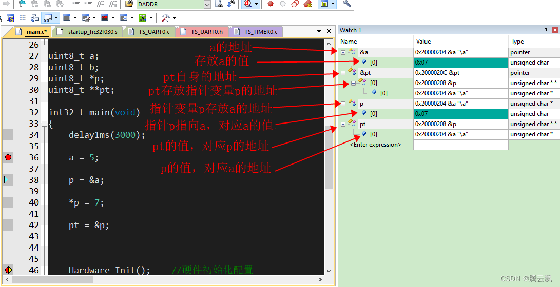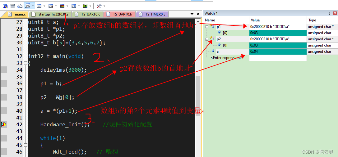 2、*p表示的是数据值,即p指针指向地址的内容。不能给*p赋地址值,如*p = &a; 这是错误的,无法通过编译;*p表示的是数据值,所以只能赋数据值。如*p = 100;或将地址值 &a 强转成数据值,如*p = (uint8_t)&a;