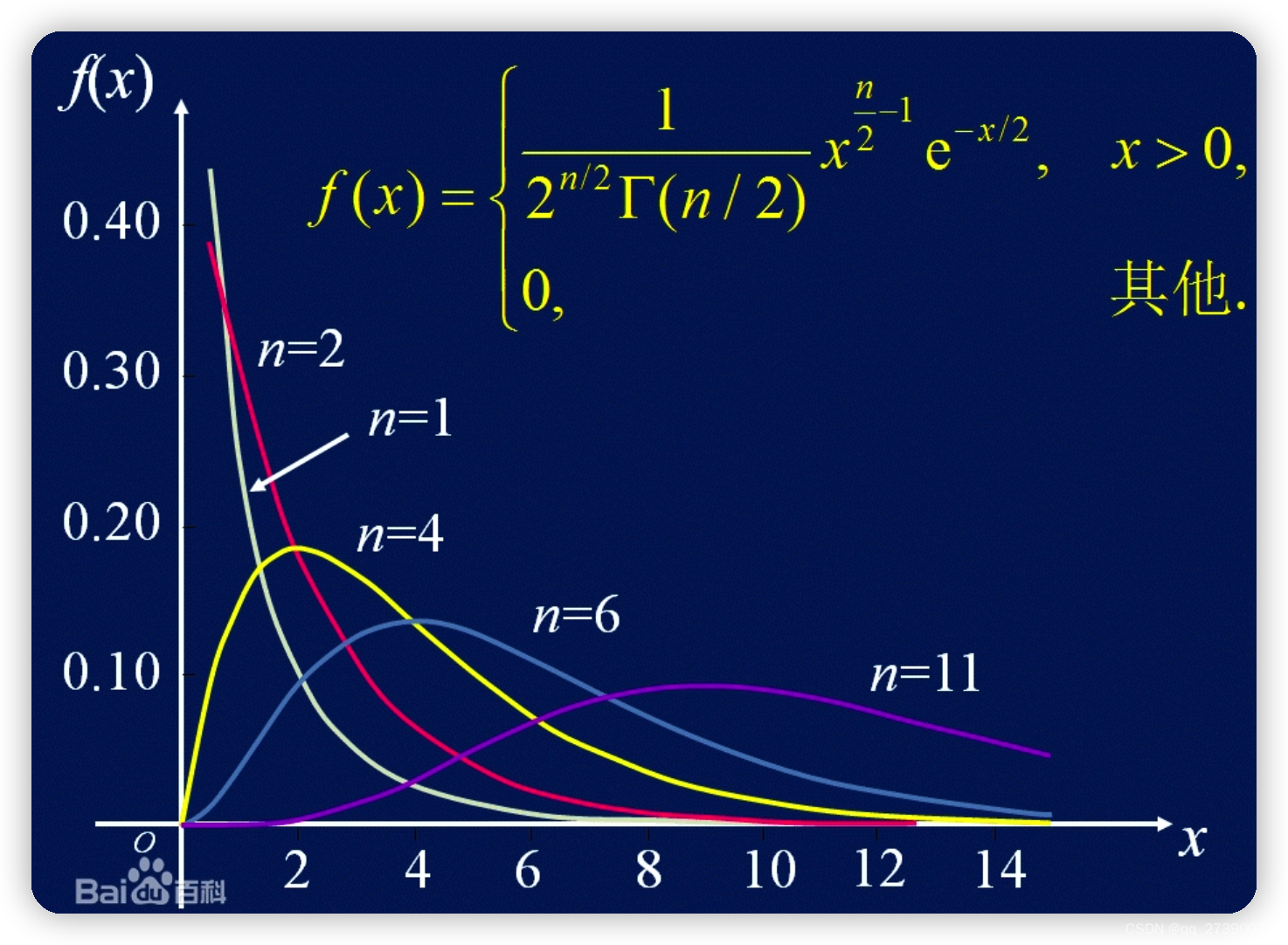 若n个相互独立的随机变量ξ₁,ξ₂,...,ξn ,均服从标准正态分布(也称独立同分布于标准正态分布),则这n个服从标准正态分布的随机变量的平方和构成一新的随机变量,其分布规律称为卡方分布(chi-square distribution)。