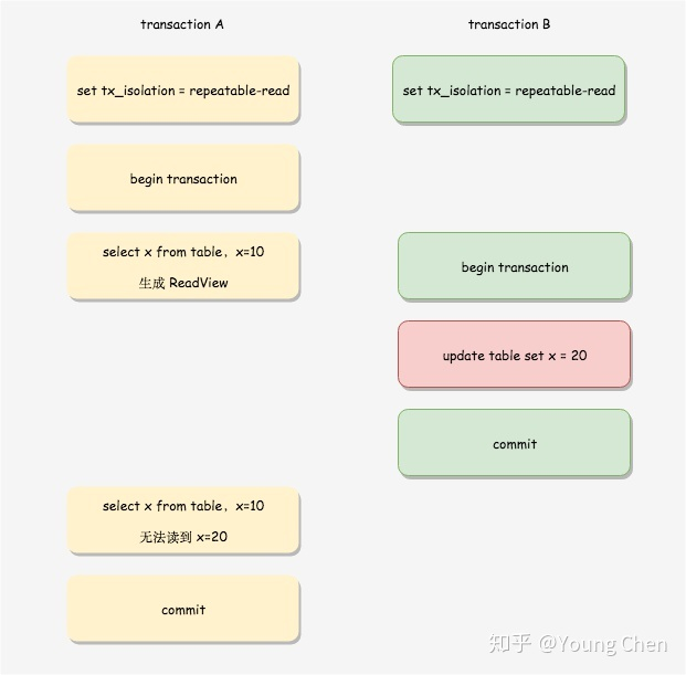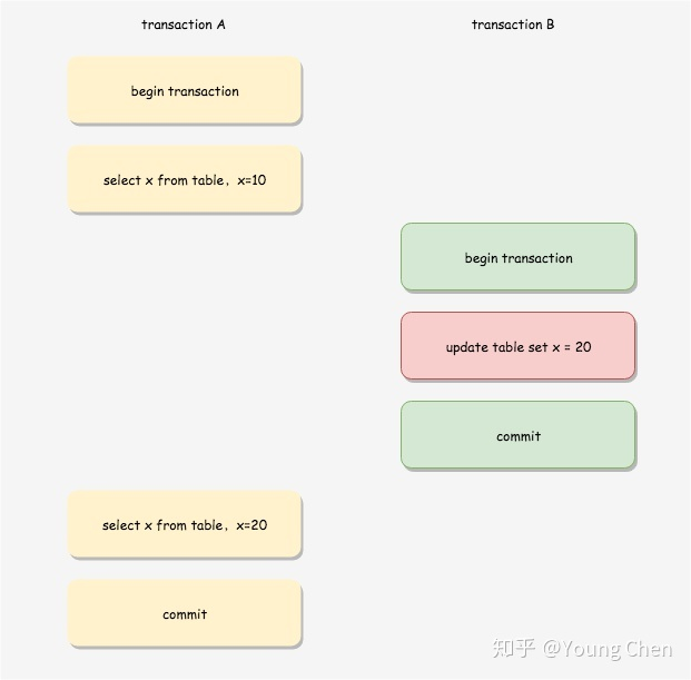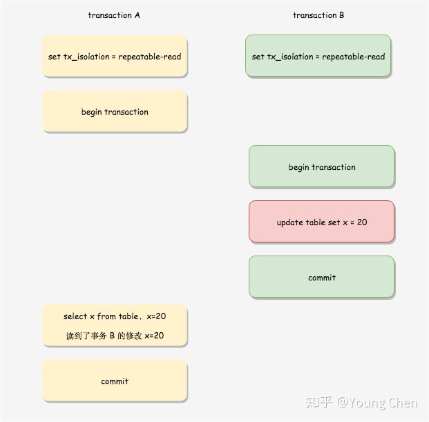 B的隔离级别是读已提交(RC),那么第一次读取到旧值10,第二次因为事务A已经提交,则读取到新值 20。 - 如果事务