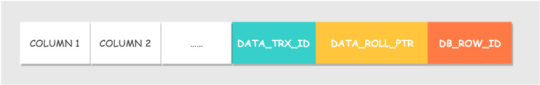 InnoDB 中 MVCC 的实现方式为:每一行记录都有两个隐藏列:DATA_TRX_ID、DATA_ROLL_PTR(如果没有主键,则还会多一个隐藏的主键列)。