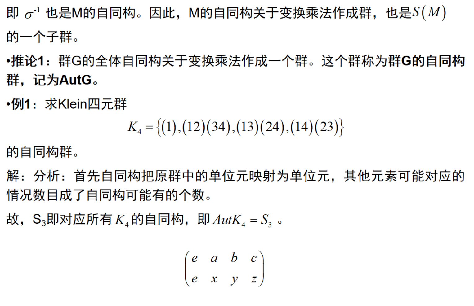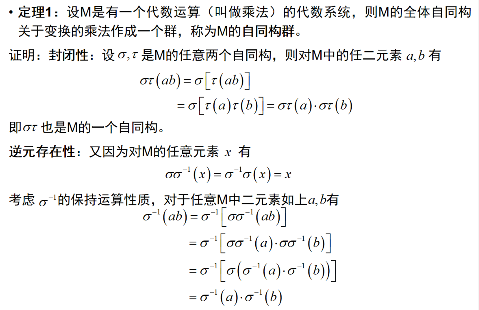 这东西看着特别绕对不对?就是这样:M是一个代数系统,M有几个自同构(就是说M上有双射映射,是M映射到M的,只要可以f(ab)=f(a)f(b)就是自同构的映射),这些自同构都是M到自己的映射,也就是变换,这些变换成一个群,叫M自同构群。