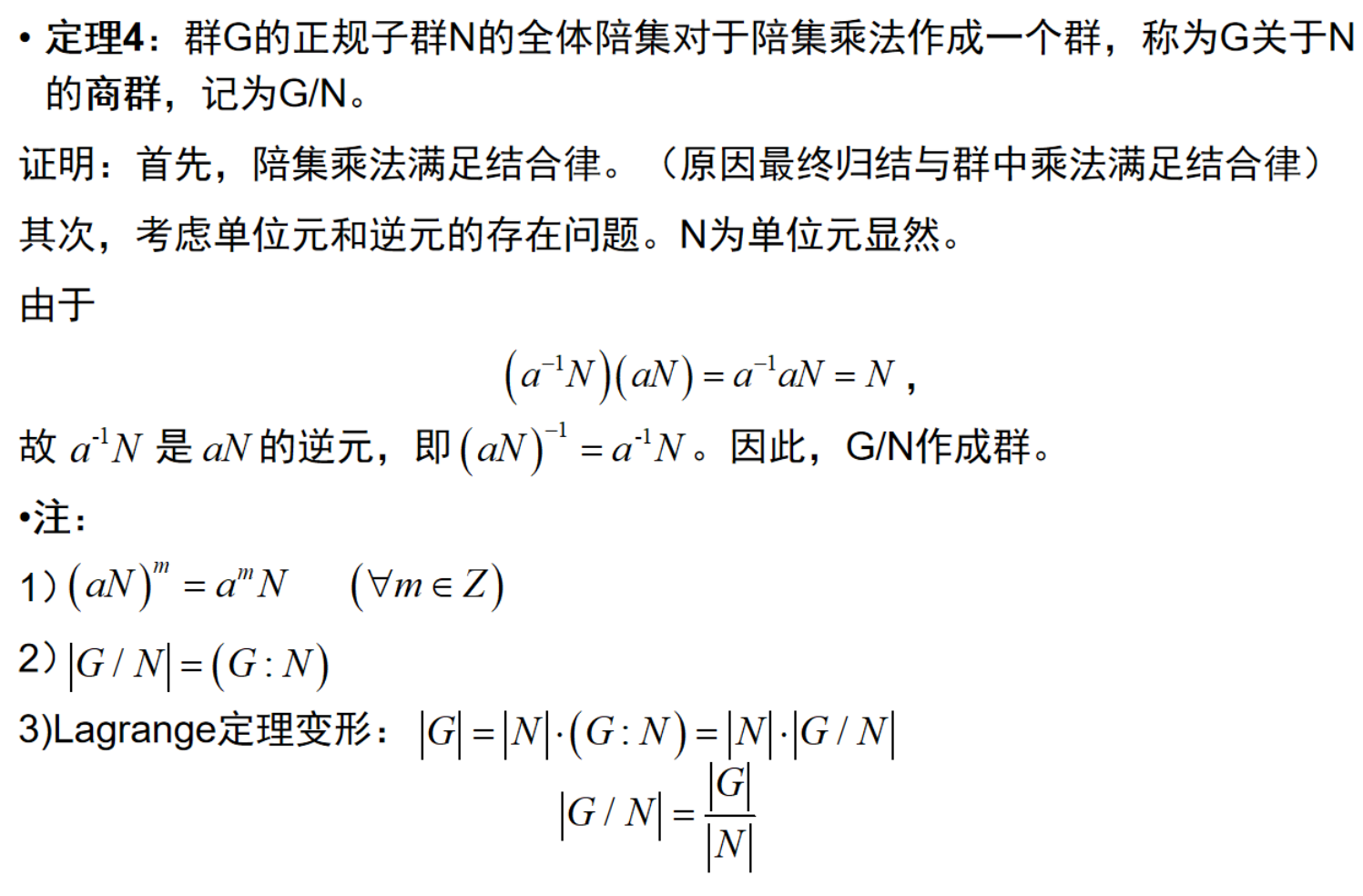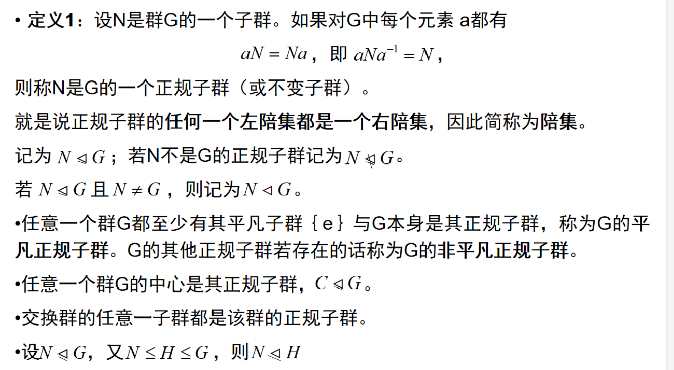 (1)N是G的正规子群,H'是G/N的一个子群(就是一个由aN,bN···组成的群),那么G肯定有一个子群H,包含了N,而且H/N=H' 。可以这样想像:H'是G/N的一个子群,是aN,bN···,既然是群,那么a,b···这些也自然是群,那么我可以写出一个包括了a,b··等元素和N,以及在aN,bN中的元素(那些会出现aN=cN现象的元素)的群H,这个群是自成体系的,N在这个群里的陪集就是aN,bN···这些,也就是说:H/N和H'是完全一样的,也就是H'=H/N.