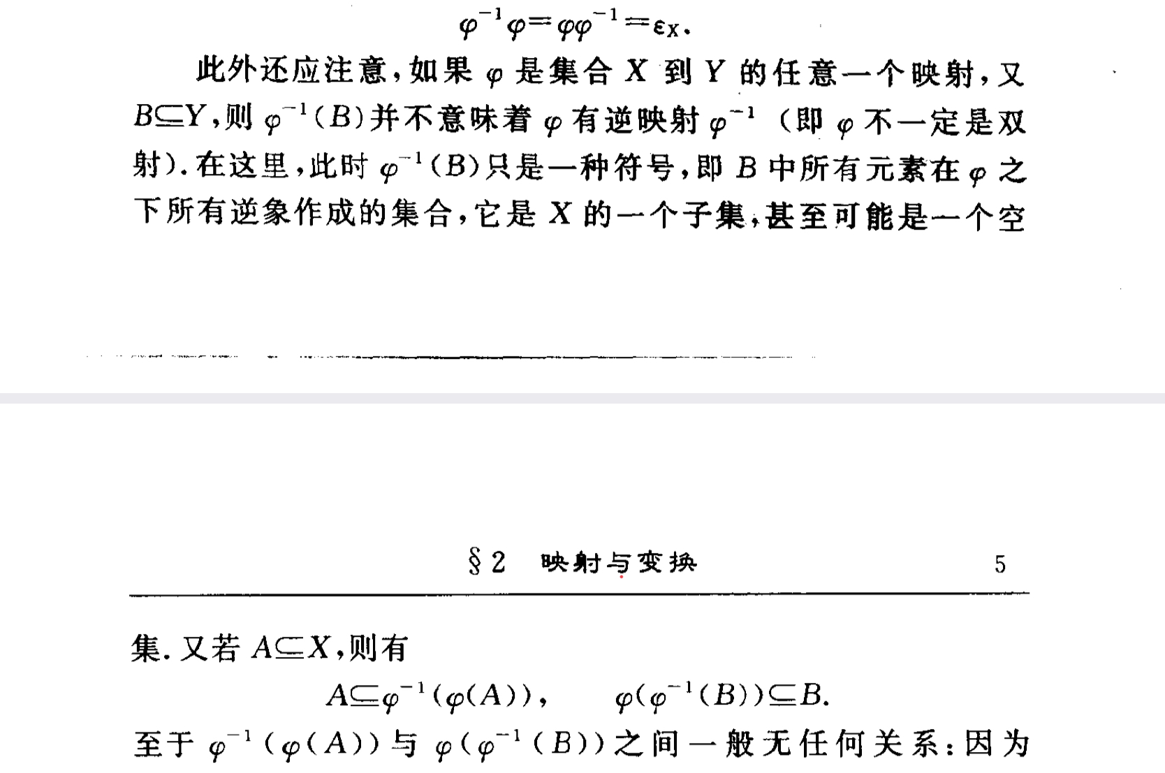 就是说:f'(A)的意思是“所有可以通过f关系映射到A的元素的集合”,这里要注意A中一些元素可能没有“逆元”,可能有很多“逆元”,所以会有上面的两个性质。