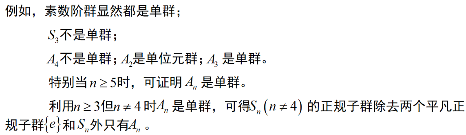 奇置换不能组成群,只有偶置换能成群。偶置换的总集合An是单群,里面没有正规子群,Sn也就没有其他正规子群的希望了。