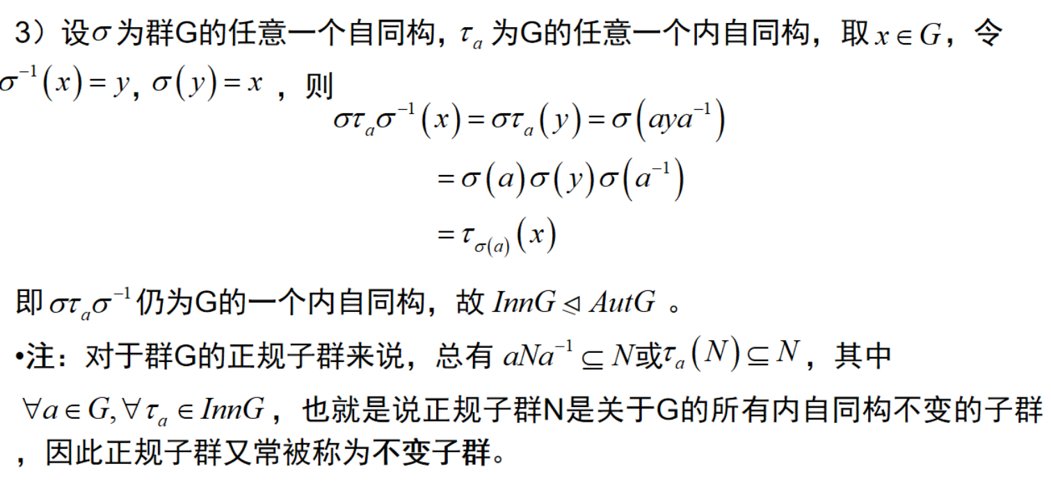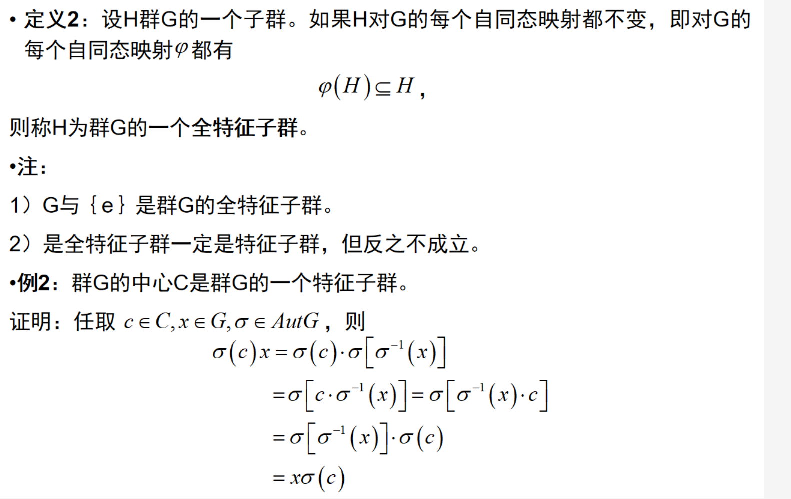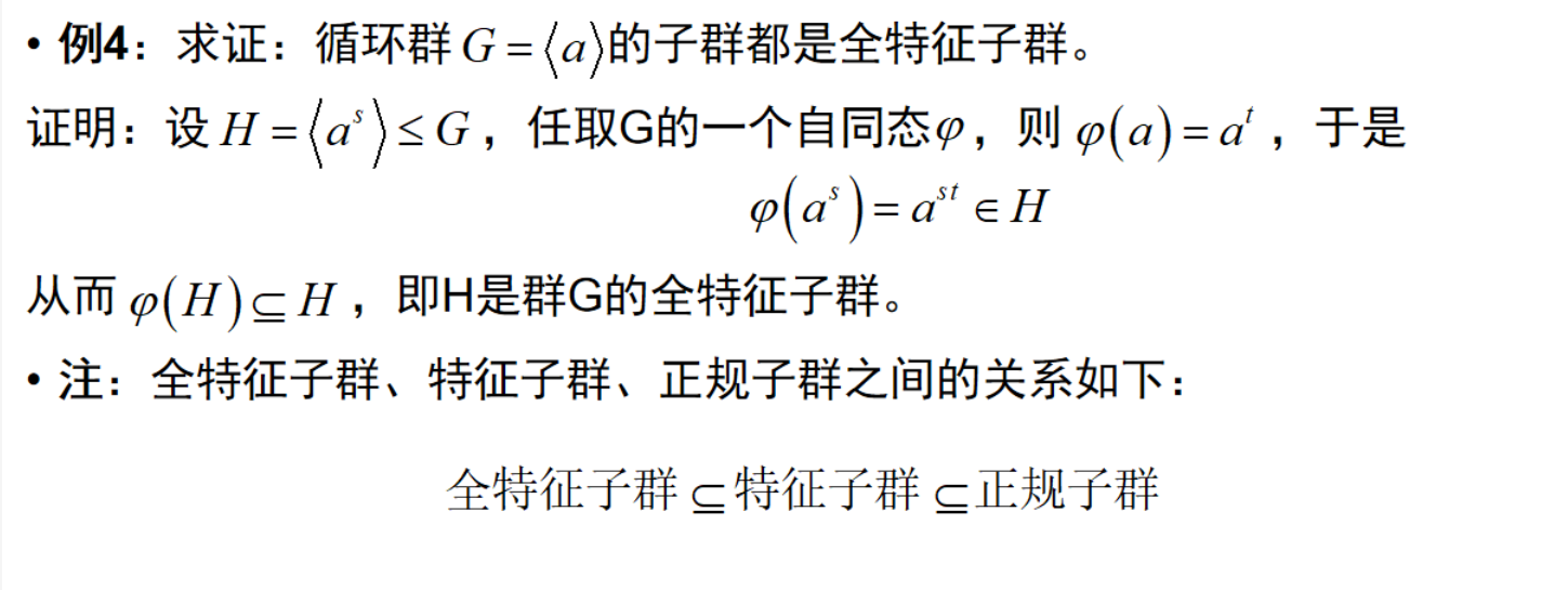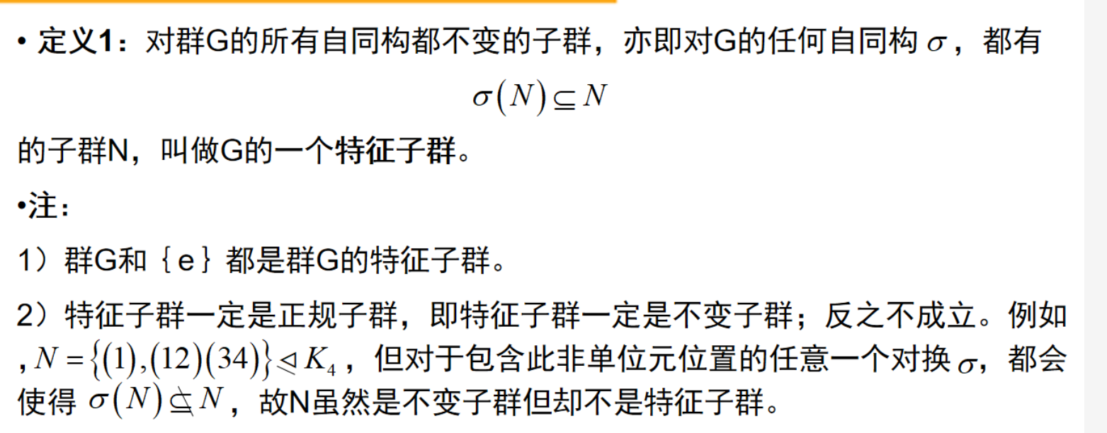 注意,这里是任意的自同构,可能不是axa-1这种为正规子群量身定制的映射,所以正规子群不一定是特征子群,但是特征子群一定是正规子群,因为特征子群已经经受了axa-1的考验了。