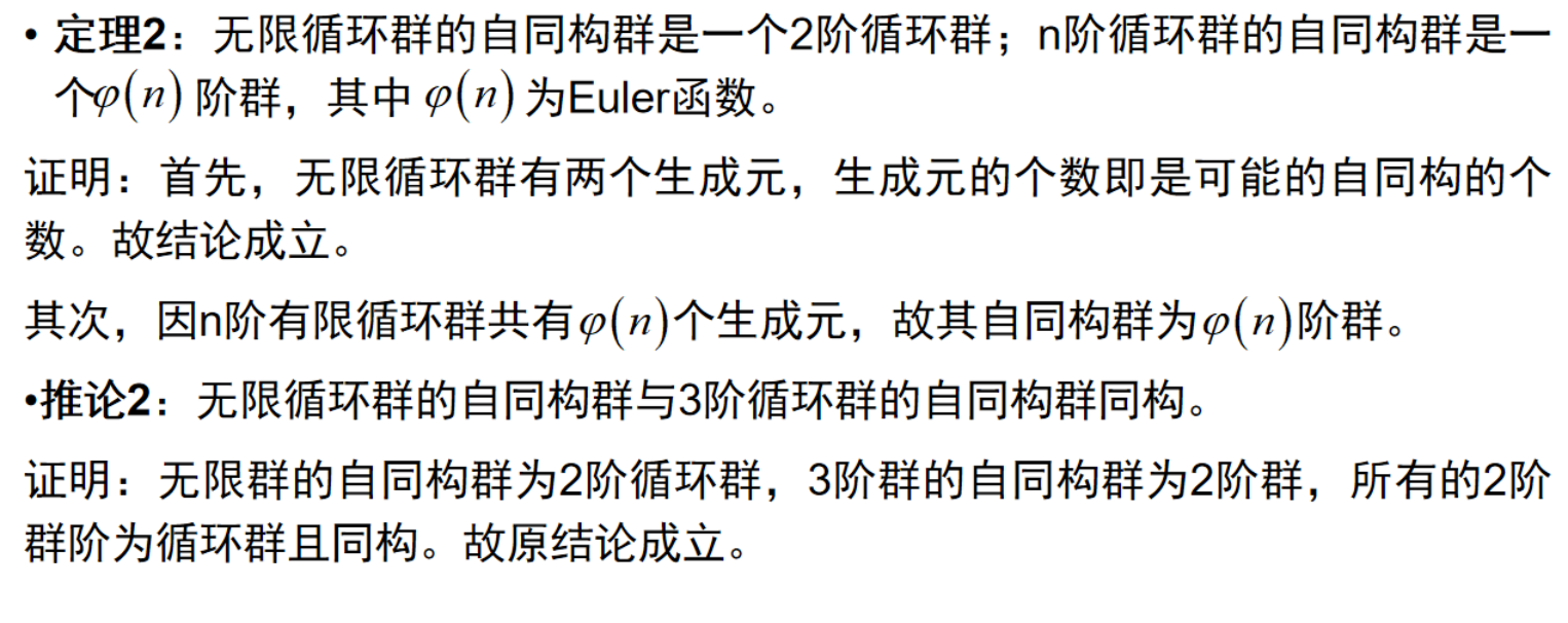 这里讲一下:为什么循环群的自同态都是a->at这样的套路呢?我们可以想一下,假如a->a2,a2->a3,a3->a4,那a*a2=a3,a2*a3=a5,可a3->a4呀,所以其他的不行。