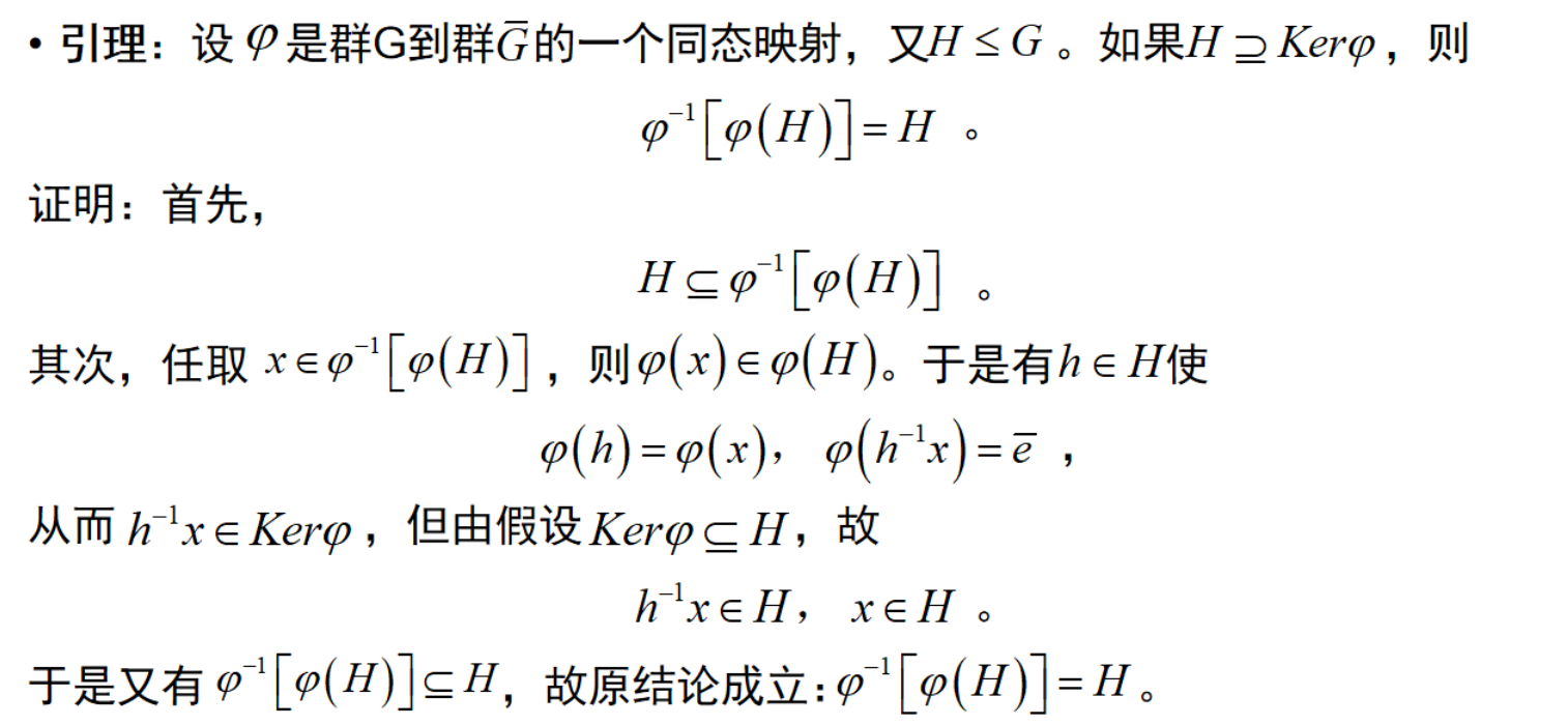 发(h-1x)=法(h-1)法(x)=e'。用简单的话讲:只要G的子群H包含了核,那么他映射过去返回来就还是自己,不会变大。