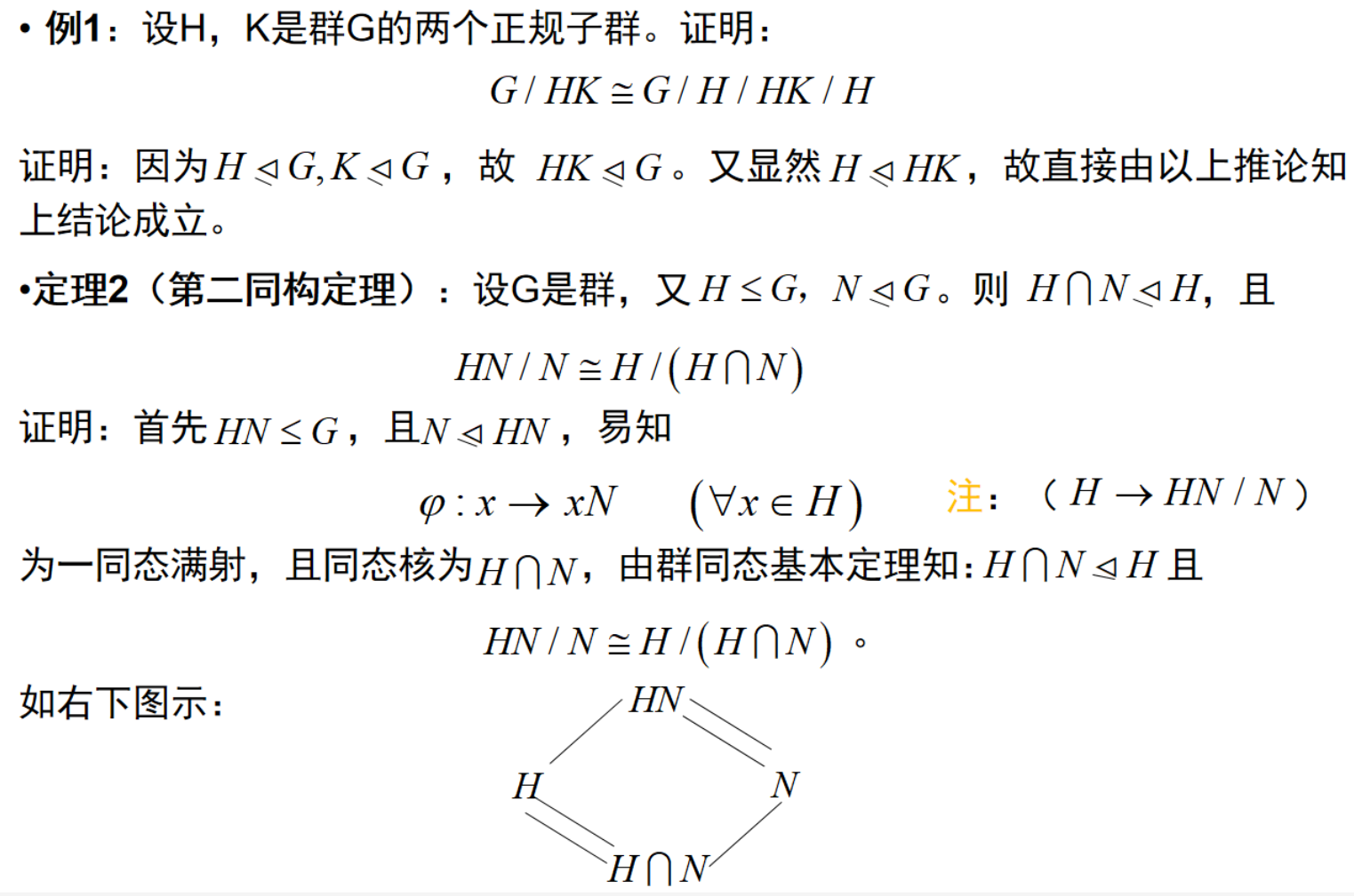用人话讲是:G有一个子群H,一个正规子群N,则H和N的交集是正规子群,且HN对N的商群和H对(H和N的交集)的商群是同构的。
