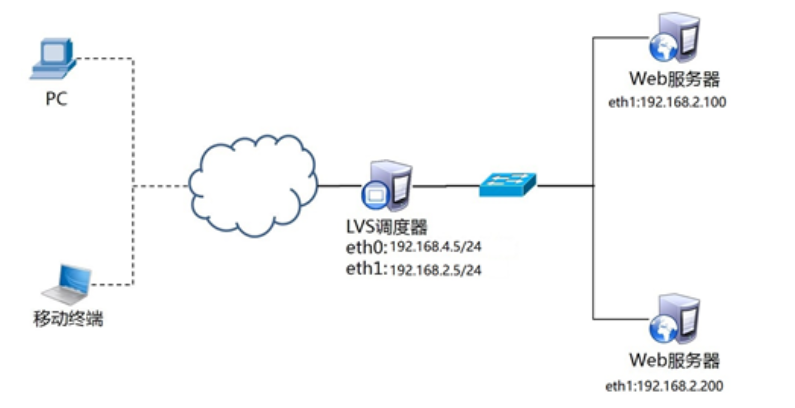 使用4台虚拟机,1台作为Director调度器、2台Real Server、1台客户端,结构如下图所示: