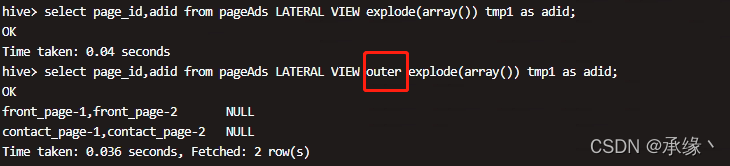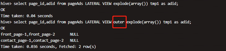 UDTF默认是忽略输出空的,outer关键字的作用是在UDTF转换列的时候将其中的空也给展示出来,显示为NULL,如下:
