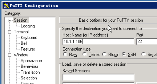 登录实验机后,打开桌面上的putty程序,输入10.1.1.106,再点击Open.。