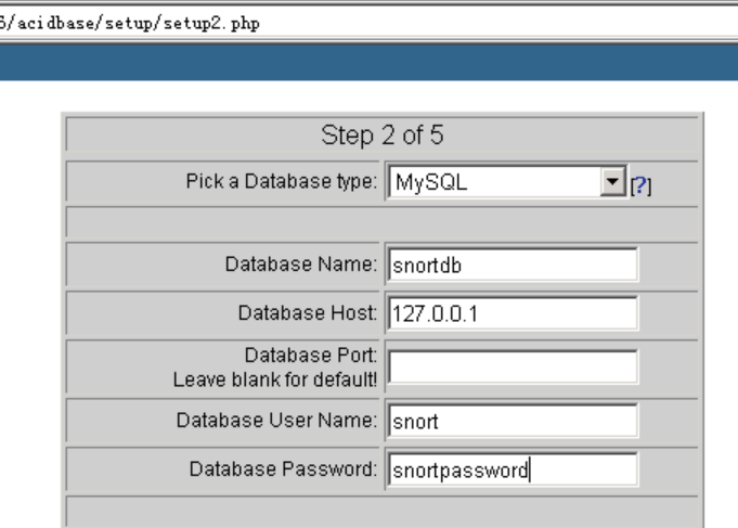 输入数据库信息,Pick a Database type:MySQL,Database Name:snortdb,Database Host:127.0.0.1,Database User Name:snort,Database Password:snortpassword