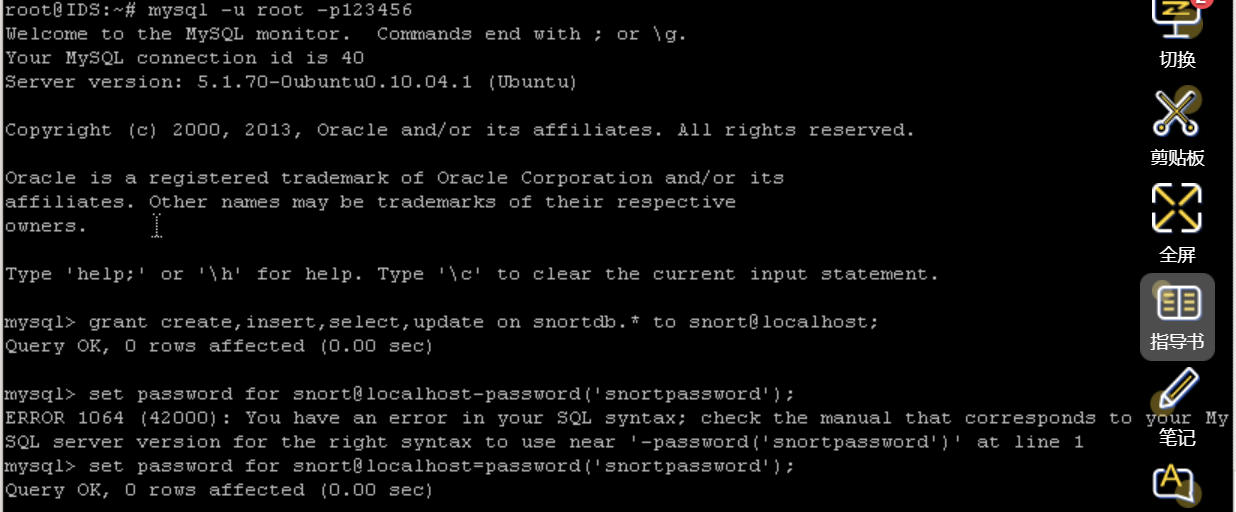 mysql> set password for snort@localhost=password('snortpassword');