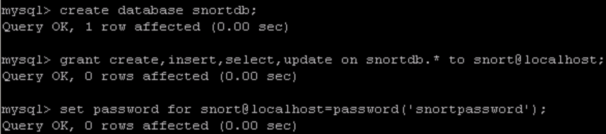 mysql> grant create, insert, select, update on snortdb.* to snort@localhost;