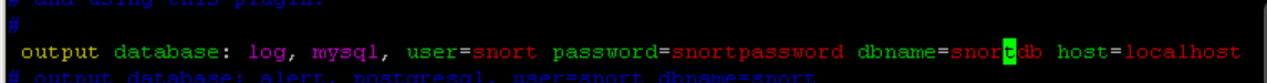 output database: log, mysql, user=snort password=snortpassword dbname=snortdb host=localhost