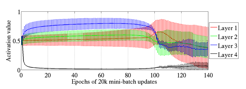 -该图显示深层结构中不同隐藏层的监督学习期间激活值(sigmoid)的平均值和标准差。